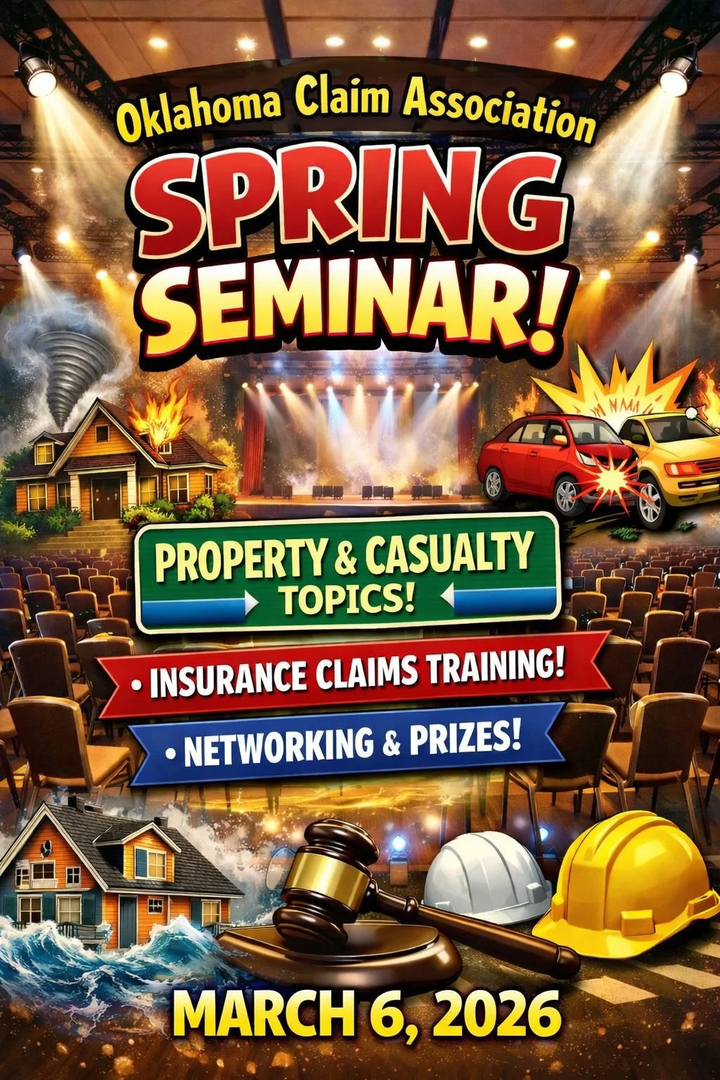 Oklahoma Claim Association's Spring Seminar Friday, March 6, 2026 8:00 AM 3:00 PM OU Tulsa Campus, Schusterman Learning Center 4502 East 41st Street Tulsa, OK, 74135 United States (map) Google Calendar ICS